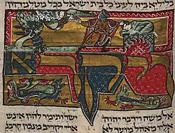 Some illustrations from the Middle Ages feature fantastic creatures—usually animal-headed humanoids, even when the depictions are quite clearly meant to be those of historical or mythological humans, known as zoocephalic figures.[28] A well-known example is the Birds' Head Haggadah (Germany, circa 1300). Although it is theorized that zoocephalic art is to circumvent a prohibition of aniconism in Judaism, understood to prohibit idolatry, the fact that some manuscripts also include human faces casts doubt on this assumption. The reasons for this illustration style are not fully understood.[29]