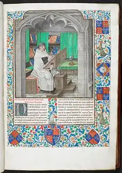 By the 14th century, the cloisters of monks writing in the scriptorium had almost fully given way to commercial urban scriptoria, especially in Paris, Rome and the Netherlands.[7] While the process of creating an illuminated manuscript did not change, the move from monasteries to commercial settings was a radical step. Demand for manuscripts grew to an extent that monastic libraries began to employ secular scribes and illuminators.[1] These individuals often lived close to the monastery and, in instances, dressed as monks whenever they entered the monastery, but were allowed to leave at the end of the day. Illuminators were often well known and acclaimed and many of their identities have survived.