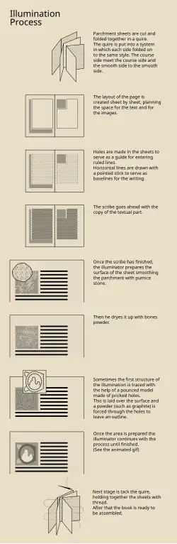 The following steps outline the detailed labor involved to create the illuminations of one page of a manuscript: