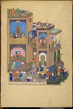 The Persian miniature tradition mostly began in whole books, rather than single pages for muraqqas or albums, as later became more common. The Great Mongol Shahnameh, probably from the 1330s, is a very early manuscript of one of the most common works for grand illustrated books in Persian courts.