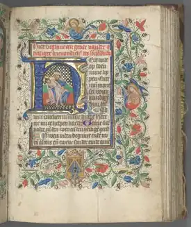 Other illuminated liturgical books appeared during and after the Romanesque period. These included psalters, which usually contained all 150 canonical psalms,[10] and small, personal devotional books made for lay people known as books of hours that would separate one's day into eight hours of devotion.[11] These were often richly illuminated with miniatures, decorated initials and floral borders. They were costly and therefore only owned by wealthy patrons, often women.