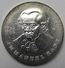 When his body was transferred to a new burial spot, his skull was measured during the exhumation and found to be larger than the average German male's with a "high and broad" forehead.[47] His forehead has been an object of interest ever since it became well known through his portraits: "In Döbler's portrait and in Kiefer's faithful if expressionistic reproduction of it—as well as in many of the other late eighteenth- and early-nineteenth-century portraits of Kant—the forehead is remarkably large and decidedly retreating."[48]