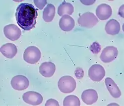 Blood film showing giant platelets — arrows — in a person with ITP (Giemsa stain)