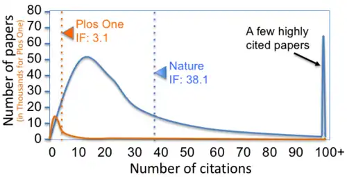 - ^ Larivière V, Kiermer V, MacCallum CJ, McNutt M, Patterson M, Pulverer B, et al. (2016). "A Simple Proposal for the Publication of Journal Citation Distributions". bioRxiv 10.1101/062109.