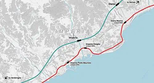 The Genoa–Ventimiglia railway line runs through Imperia: the city is served by a central Imperia railway station, on a double-track route opened on 11 December 2016,[11] replacing the old narrow coastal route confined by the sea and long tunnels under the rocky coastline, and therefore built as a single-track railway. The old route was originally built in 1872 and closed with the opening of the new inland route; the city was served by two railway stations serving the two centres of Imperia, Imperia Porto Maurizio and Imperia Oneglia railway station.[12]