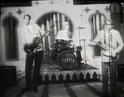 The low-def black and white footage was filmed on old Kinescope cameras, following Cobain's request that Kerslake use authentic cameras from the period, and the band's performance was improvised.[34] The satirical tone was a result of Cobain being "so tired for the last year of people taking us so seriously . . . I wanted to fuck off and show them that we have a humorous side to us".[35] The video begins with an unnamed variety show host, played by Doug Llewelyn, former host of American reality show The People's Court, introducing Nirvana to an in-studio crowd of young fans, whose screaming is heard throughout the duration of the song. The band members, whom the host refers to as "thoroughly all right and decent fellas," perform dressed in suits, while Cobain wears glasses that made him dizzy.[36] As Cobain explained in a 1992 Melody Maker interview, "We wanted to be like The Beatles – no, The Dave Clark Five, I was wearing glasses – we would never make fun of The Beatles."[37][38] Novoselic had cut his hair short for the video, and liked it so much he kept it that way afterwards.[36] As the song progresses, the band members destroy their instruments and the set.