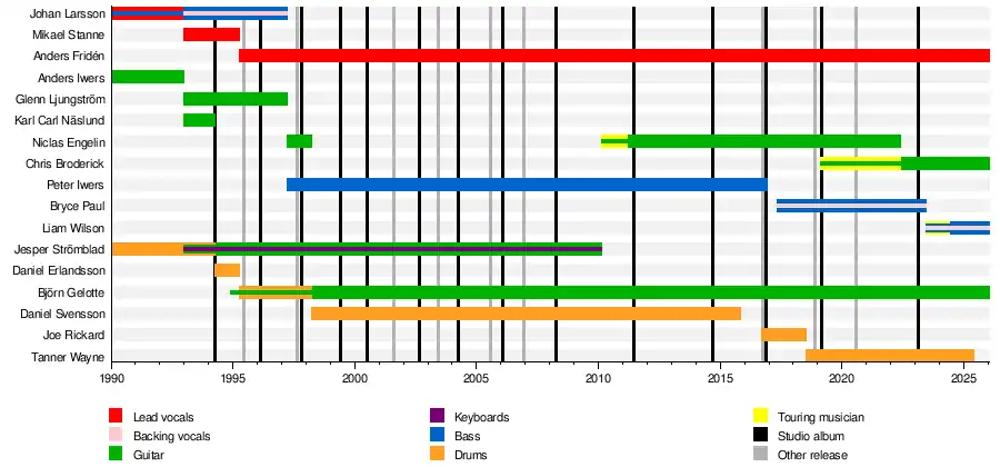 The lineup of Strömblad, Ljungström, Larsson, Gelotte and Fridén released The Jester Race in 1996 and Whoracle in 1997.[103] By the end of the recording for Whoracle, however, both Ljungström and Larsson had announced that they were leaving the band. They were replaced for a short tour by Niclas Engelin and Peter Iwers, both of whom were ultimately retained as official members.[98] Engelin only remained until the following year, however, and his role was taken over by Gelotte.[104] The vacated position of drummer was soon filled by Daniel Svensson.[105] The band's lineup remained stable for over a decade, releasing several albums.[103]