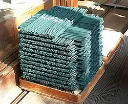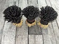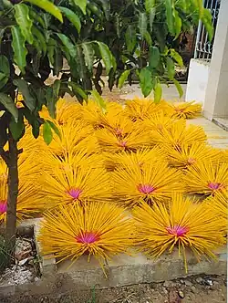 The basic ingredients are the bamboo stick, the paste (generally made of charcoal dust and joss/jiggit/gum/tabu powder – an adhesive made from the bark of litsea glutinosa and other trees),[52] and the perfume ingredients - which would be a masala (spice mix) powder of ground ingredients into which the stick would be rolled, or a perfume liquid sometimes consisting of synthetic ingredients into which the stick would be dipped. Perfume is sometimes sprayed on the coated sticks. Stick machines are sometimes used, which coat the stick with paste and perfume, though the bulk of production is done by hand rolling at home. There are about 5,000 incense companies in India that take raw unperfumed sticks hand-rolled by approximately 200,000 women working part-time at home, and then apply their own brand of perfume, and package the sticks for sale.[53] An experienced home-worker can produce 4,000 raw sticks a day.[54] There are about 50 large companies that together account for up to 30% of the market, and around 500 of the companies, including a significant number of the main ones, including Moksh Agarbatti, PremaNature, and Cycle Pure, are based in Mysore.[55]