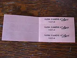 Papier d'Arménie was originally sold as a disinfectant as well as for the fragrance.