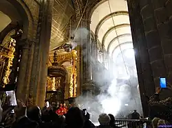 Incense fragrances can be of such great strength that they obscure less desirable odours. This utility led to the use of incense in funerary ceremonies because the incense could smother the scent of decay. An example, as well as of religious use, is the giant Botafumeiro thurible that swings from the ceiling of the Cathedral of Santiago de Compostela. It is used in part to mask the scent of the many tired, unwashed pilgrims huddled together in the Cathedral of Santiago de Compostela.[56]