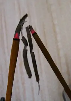Traditionally, the bamboo core of cored stick incense is prepared by hand from Phyllostachys heterocycla cv. pubescens since this species produces thick wood and easily burns to ashes in the incense stick.[32] In a process known as "splitting the foot of the incense stick", the bamboo is trimmed to length, soaked, peeled, and split in halves until the thin sticks of bamboo have square cross sections of less than 3mm.[33][34] This process has been largely replaced by machines in modern incense production.[35]