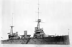 At the time the final design of Indefatigable was approved, the Admiralty was already moving on, Fisher writing in September 1908 "I've got Sir Philip Watts into a new Indomitable that will make your mouth water when you see it", a design that was to eventually emerge as HMS Lion. In August 1909 the self-governing dominions met at the 1909 Imperial Conference, and in discussion of Imperial defence, the Admiralty proposed the creation of indigenous fleet units, each to consist of one Invincible-class battlecruiser, three light cruisers of the Bristol class, and six destroyers. These were to be based in Australia, New Zealand, Canada and South Africa in an attempt to secure the naval defence of the Dominions while the Royal Navy concentrated in home waters to meet the German threat. While the scheme was rejected by Canada and South Africa, Australia and New Zealand subscribed, each ordering a modified version of the Indefatigable, rather than the originally proposed Invincible class.[2] Australia became a ship of the newly formed Royal Australian Navy, while New Zealand was retained in European waters as a wholly RN unit.[3] Eventually, only one fleet unit was formed, the Australian squadron in 1913.[4]