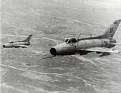 By late 1971, the intensification of the independence movement in East Pakistan lead to the Bangladesh Liberation War between India and Pakistan.[48] On 22 November 1971, 10 days before the start of a full-scale war, four PAF F-86 Sabre jets attacked Indian and Mukti Bahini positions at Garibpur, near the international border, however, Two of the four PAF Sabres were shot down and one damaged by the IAF's Folland Gnats.[49] On 3 December, India formally declared war against Pakistan following massive preemptive strikes by the PAF against Indian Air Force installations in Srinagar, Ambala, Sirsa, Halwara and Jodhpur. However, the strikes failed, as the IAF did not suffer any significant damage because of advance intelligence, and the leadership had anticipated such a move and precautions were taken.[50] The Indian Air Force was quick to respond to Pakistani air strikes, following which the PAF carried out mostly defensive sorties.[51]