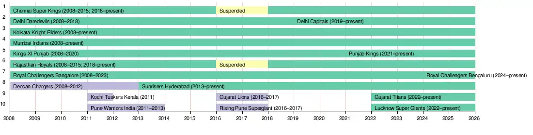 In June 2015, the two-time champions Chennai Super Kings and the inaugural season champions Rajasthan Royals were suspended for two seasons following their involvement in a spot-fixing and betting scandal.[38] The two teams were replaced for two seasons by Rising Pune Supergiant and Gujarat Lions, based in Pune and Rajkot, respectively.[39][40]