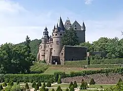 The exteriors of "Brunwald Castle" were filmed at Bürresheim Castle in West Germany. In the movie the image of the castle has been flipped and the building was expanded with a Matte painting depicting a copy of the right facade to the left of the main tower. Filming for the castle interiors took place in the United Kingdom from June 5 to 10, 1988, at Elstree Studios in Borehamwood, England. On June 16, Lawrence Hall, London, was used as the interior of Berlin Tempelhof Airport. Filming returned to Elstree the next day to capture the motorcycle escape, continuing at the studio for interior scenes until July 18. One day was spent at North Weald Airfield on June 29 to film Indiana leaving for Venice.[13] Ford and Connery acted much of the Zeppelin table conversation without trousers on because of the overheated set.[21] Spielberg, Marshall and Kennedy interrupted the shoot to make a plea to the Parliament of the United Kingdom to support the economically "depressed" British studios. July 20–22 was spent filming the temple interiors. The temple set, which took six weeks to build, was supported on 80 feet (24 m) of hydraulics and ten gimbals for use during the earthquake scene. Resetting between takes took twenty minutes while the hydraulics were put to their starting positions and the cracks filled with plaster. The shot of the Grail falling to the temple floor—causing the first crack to appear—was attempted on the full-size set, but proved too difficult. Instead, crews built a separate floor section that incorporated a pre-scored crack sealed with plaster. It took several takes to throw the Grail from 6 feet (1.8 m) onto the right part of the crack.[23] July 25–26 was spent on night shoots at Stowe School, Stowe, Buckinghamshire, for the Nazi rally.[13]