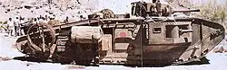 Mechanical effects supervisor George Gibbs said the film was the most difficult one of his career.[23] He visited a museum to negotiate renting a small French World War I tank, but decided he wanted to make one.[13] The tank was based on the Tank Mark VIII, which was 11 metres (36 ft) long and weighed 28 short tons (25 t). However, some liberties were taken with the design.[28] Gibbs built the tank over the framework of a 28-short-ton (25 t) excavator and added 7-short-ton (6.4 t) tracks that were driven by two automatic hydraulic pumps, each connected to a Range Rover V8 engine. Gibbs built the tank from steel rather than aluminum or fiberglass because it would allow the realistically suspensionless vehicle to endure the rocky surfaces. Unlike its historic counterpart, which had only the two side guns, the tank had a turret gun added as well. It took four months to build and was transported to Almería on a Short Belfast plane and then a low loader truck.[23]