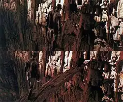 Spielberg devised the three trials that guard the Grail.[3] For the first, the blades under which Indiana ducks like a penitent man were a mix of practical and miniature blades created by Gibbs and ILM. For the second trial, in which Indiana spells "Iehova" on stable stepping stones, it was intended to have a tarantula crawl up Indiana after he mistakenly steps on "J". This was filmed and deemed unsatisfactory, so ILM filmed a stuntman hanging through a hole that appears in the floor, 30 feet (9.1 m) above a cavern. As this was dark, it did not matter that the matte painting and models were rushed late in production. The third trial, the leap of faith that Indiana makes over an apparently impassable ravine after discovering a bridge hidden by forced perspective, was created with a model bridge and painted backgrounds. This was cheaper than building a full-size set. A puppet of Ford was used to create a shadow on the 9-foot-tall (2.7 m) by 13-foot-wide (4.0 m) model because Ford had filmed the scene against bluescreen, which did not incorporate the shaft of light from the entrance.[29]