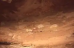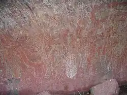 Rock art, including painting and engraving or carving (petroglyphs), can be found at sites throughout Australia. Examples of rock art have been found that are believed to depict extinct megafauna such as Genyornis[4] and Thylacoleo in the Pleistocene era[5] as well as more recent historical events such as the arrival of European ships.[6]