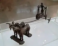 Miniature votive images or toys from Harappa, c. 2500 BCE, clay figurines of zebu oxen, a cart, and a chicken.