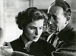 In 1961, Bergman's second American television production, Twenty-four Hours in a Woman's Life, was produced by her third husband, Lars Schmidt.[109] Bergman played a bereaved wife in love with a younger man she has known for only 24 hours.[110] She later starred in Goodbye Again as Paula Tessier, a middle-aged interior designer who falls in love with Anthony Perkins' character, fifteen years her junior. Paula is in a relationship with Roger Demarest, a womanizer, played by Yves Montand. Roger loves Paula but is reluctant to give up his womanizing ways. When Perkins starts pursuing her, the lonely Paula is suddenly forced to choose between the two men.[111] In his review of the film, Bosley Crowther wrote that Bergman was neither convincing nor interesting in her part as Perkins's lover.[112]