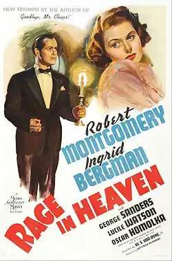 Bergman was loaned out of David O. Selznick's company, to appear in three films which were released in 1941. On 18 February, Robert Sherwood Productions' released her second collaboration with Gregory Ratoff, Adam Had Four Sons.[36] On 7 March, Metro-Goldwyn-Mayer released W. S. Van Dyke's Rage in Heaven.[37] On 12 August, Victor Fleming's Dr. Jekyll and Mr. Hyde, another Metro-Goldwyn-Mayer production, had its New York opening. Bergman was supposed to play the "good girl" role of Dr Jekyll's fiancée but pleaded with the studio that she should play the "bad girl" Ivy, the saucy barmaid.[38] Reviews noted that "she gave a finely-shaded performance". A New York Times review stated that "the young Swedish actress proves again, that a shining talent can sometimes lift itself above an impossibly written role".[34]: 84 Another review said: "she displays a canny combination of charm, understanding, restraint and sheer acting ability."[34]: 85