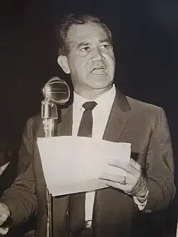 Miguel Alemán was the PRI's candidate in the 1946 elections, but he did not run unopposed. Alemán and his circle had hoped to abandon sectoral representation in the party and separate the party as an organism of the state, but there was considerable pushback from the labor sector and the CTM, which would have lost influence, along with the other sectors. The structure of the party remained sectoral, but the Alemanistas abandoned the goal that had been "the preparation of the people for the implementation of a workers' democracy and for the arrival of a socialist regime."[71] The party slogan was changed from the PRM's "[f]or a workers' democracy" (Por una democracia de trabajadores) to the PRI's "[d]emocracy and justice" (Democracia y justicia).