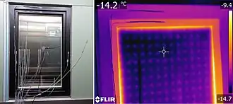 This trade-off does not apply to vacuum insulated glass (VIG), or evacuated glazing,[14] as heat loss due to convection is eliminated, leaving radiation losses and conduction through the edge seal and required supporting pillars over the face area.[15][16] These VIG units have most of the air removed from the space between the panes, leaving a nearly-complete vacuum. VIG units which are currently on the market are hermetically sealed along their perimeter with solder glass, that is, a glass frit (powdered glass) having a reduced melting point is heated to join the components. This creates a glass seal that experiences increasing stress with increasing temperature differential across the unit. This stress may limit the maximum allowable temperature differential. One manufacturer provides a recommendation of 35 °C. Closely spaced pillars are required to reinforce the glazing to resist the pressure of the atmosphere. Pillar spacing and diameter limited the insulation achieved by designs available beginning in the 1990s to R = 4.7 h·°F·ft2/BTU (0.83 m2·K/W) no better than high quality double glazed insulated glass units. Recent products claim performance of R = 14 h·°F·ft2/BTU (2.5 m2·K/W) which exceeds triple glazed insulated glass units.[16] The required internal pillars exclude applications where an unobstructed view through the glazing unit is desired, i.e. most residential and commercial windows, and refrigerated food display cases. VIG equipped windows, however, under-perform due to intense edge heat transfer.[13]