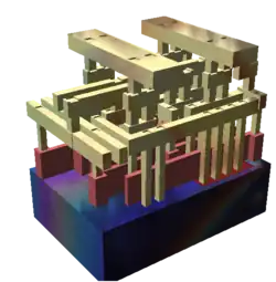 Rendering of a small standard cell with three metal layers (dielectric has been removed). The sand-colored structures are metal interconnect, with the vertical pillars being contacts, typically plugs of tungsten. The reddish structures are polysilicon gates, and the solid at the bottom is the crystalline silicon bulk.