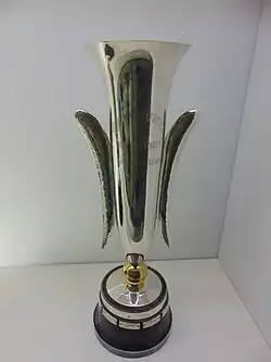 ![]() Fairs Cup Trophy (Barcelona Museum). It bears the French name of the tournament, Coupe Internationale des Villes de Foires ("International Fairs Cities Cup").[1] | |