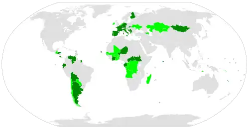 The Optional Protocol was adopted by the UN General Assembly on 10 December 2008.[68] It was opened for signature on 24 September 2009,[69] and as of December 2025 has been signed by 46 parties and ratified by 31.[70] Having passed the threshold of required ratifications, it has entered into force on 5 May 2013.[71]