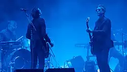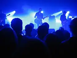 Having first performed at Luna Lounge alongside peers such as the Strokes, Longwave, the National, and Stellastarr, Interpol is one of the bands associated with the New York indie music scene and one of several groups that emerged from the post-punk revival of the 2000s.[3] The band's sound is generally a mix of staccato bass and rhythmic, harmonized guitar with a snare-heavy mix, drawing comparisons to post-punk bands such as Joy Division, Television and the Chameleons,[4] and also to Echo & the Bunnymen and Siouxsie and the Banshees.[5] The band has no primary songwriter, with each member contributing to composition.[6]