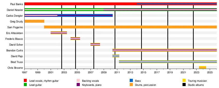 Interpol is an American rock band from Manhattan, New York.[1][2] Formed in 1997, their original line-up consisted of Paul Banks (lead vocals, rhythm guitar), Daniel Kessler (lead guitar, backing vocals), Carlos Dengler (bass guitar, keyboards), and Greg Drudy (drums). Drudy left the band in 2000 and was replaced by Sam Fogarino. Dengler left to pursue other projects in 2010, with Banks taking on the additional in-studio role of bassist instead of hiring a new one.