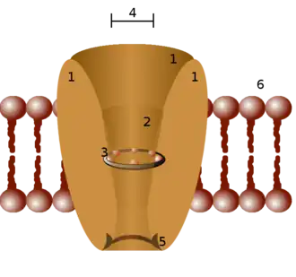 Schematic diagram of an ion channel. 1 - channel domains (typically four per channel), 2 - outer vestibule, 3 - selectivity filter, 4 - diameter of selectivity filter, 5 - phosphorylation site, 6 - cell membrane.