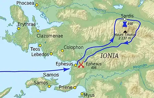 In the spring of 498 BC, an Athenian force of twenty triremes, accompanied by five from Eretria, set sail for Ionia.[33] They joined up with the main Ionian force near Ephesus.[40] Declining to personally lead the force, Aristagoras appointed his brother Charopinus and another Milesian, Hermophantus, as generals.[37]