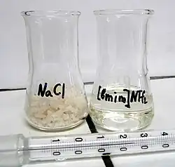 An ionic liquid (IL) is a salt in the liquid state at ambient conditions. In some contexts, the term has been restricted to salts whose melting point is below a specific temperature, such as 100 °C (212 °F).[1] While ordinary liquids such as water and gasoline are predominantly made of electrically neutral molecules, ionic liquids are largely made of ions. These substances are variously called liquid electrolytes, ionic melts, ionic fluids, fused salts, liquid salts, or ionic glasses.[2][3][4]