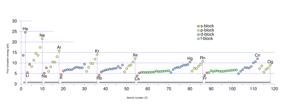 An example is presented in the figure to the right. The periodic abrupt decrease in ionization potential after rare gas atoms, for instance, indicates the emergence of a new shell in alkali metals. In addition, the local maximums in the ionization energy plot, moving from left to right in a row, are indicative of s, p, d, and f sub-shells.