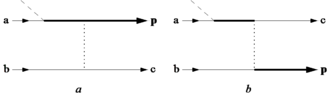 The re-scattering model in Kuchiev's version (Kuchiev's model) is quantum mechanical. The basic idea of the model is illustrated by Feynman diagrams in figure a. First both electrons are in the ground state of an atom. The lines marked a and b describe the corresponding atomic states. Then the electron a is ionized. The beginning of the ionization process is shown by the intersection with a sloped dashed line. where the MPI occurs. The propagation of the ionized electron in the laser field, during which it absorbs other photons (ATI), is shown by the full thick line. The collision of this electron with the parent atomic ion is shown by a vertical dotted line representing the Coulomb interaction between the electrons. The state marked with c describes the ion excitation to a discrete or continuum state. Figure b describes the exchange process. Kuchiev's model, contrary to Corkum's model, does not predict any threshold intensity for the occurrence of NS ionization.