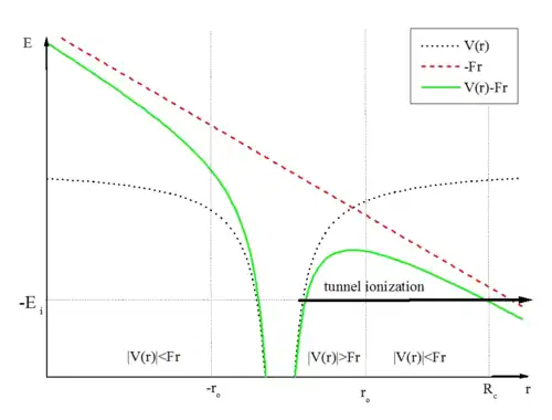 Combined potential of an atom and a uniform laser field. At distances r < r0, the potential of the laser can be neglected, while at distances with r > r0 the Coulomb potential is negligible compared to the potential of the laser field. The electron emerges from under the barrier at r = Rc. Ei is the ionization potential of the atom.