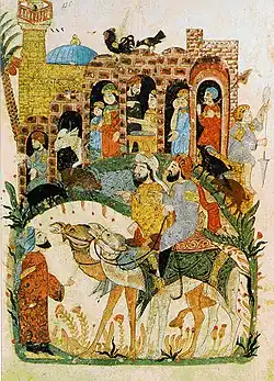The name al-ʿIrāq is attested as a common toponym in pre-Islamic Arabic poetry. The sixth-century poet Adi ibn Zayd, from the Lakhmid court at al-Ḥirah, used the name in a demographic context, speaking of the "people of Iraq" (ahl al-ʿIrāq),[20] and in a geographical sense, referring to the "central area of Iraq" (ṣaḥn al-ʿIrāq).[21][22] His contemporary, Imruʾ al-Qais, used the name in social contexts, mentioning "the abundant food of Iraq" (ṭaʿām al-ʿIrāq al-mustafīḍ) and "the patterned fabric of Iraq" (ḥawkk al-ʿIrāq al-munammaq), and in a political context, stating "his kingdom stretches from Iraq to Oman" (lahu mulk al-ʿIrāq ilā ʿUmān).[23] This usage continued into the early Islamic period. The tenth-century geographer al-Maqdisi, defending his use of "Iraq" instead of the ancient name "Babylonia", noted that it was the only name used in his time. He cited the precedent Abu Bakr, who reportedly said, "For Allah to grant a victory, even a handspan, of the Holy Land by my hand is more beloved to me than a district from the districts of Iraq" (rustāq min rasātīq al-ʿIrāq), and al-Maqdisi specifically pointed out that Abu Bakr did not say "Babylonia".[24]