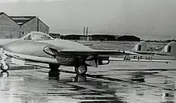 In the early 1950s, thanks to increased income from oil and agricultural exports, the RIrAF was thoroughly re-equipped. In 1951, 15 each of de Havilland Canada DHC-1 Chipmunks, Percival Provosts and North American T-6s were bought to replace obsolete de Havilland Tiger Moth trainers. With these new aircraft, the RIrAF Flying School was expanded into the Air Force College. The training curriculum was improved, and the number of students graduating each year was increased. This allowed to form a solid basis for the RIrAF's long-term growth. Also in 1951, the RIrAF bought its first helicopters: three Westland Dragonflies.[26] The RIrAF's first jet fighter was the de Havilland Vampire: 12 FB.Mk.52 fighters and 10 T.Mk.55 trainers were delivered from 1953 to 1955. These were quickly supplemented by 20 de Havilland Venoms, delivered between 1954 and 1956.[27] Following the formation of the Baghdad Pact, the United States donated at least six Cessna O-1 Bird Dogs to the RIrAF. The RAF also vacated Shaibah Air Base, and the RIrAF took over it as Wahda Air Base.[28] In 1957, six Hawker Hunter F.Mk.6s were delivered. The next year, the United States agreed to provide 36 F-86F Sabres free of charge.[29]
