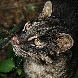 The Iriomote cat's eyes are a light amber colour.[6] The nose is large and flat, with no fur covering the reddish-brown nose leather.[6][8][9] The paw ranges from 29–37 mm (1.1–1.5 in) wide, in contrast to the 24–30 mm (0.94–1.18 in) wide paw of a domestic cat.[6]