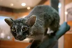 Mayailurus iriomotensis was the scientific name proposed by Yoshinori Imaizumi (今泉吉典, Imaizumi Yoshinori) in 1967 for the Iriomote cat. Imaizumi pointed out that, compared to other leopard cats, the Iriomote cat retained some especially primitive features. Judging from these characteristics, he estimated that the Iriomote cat evolved as a species sometime between ten million years ago in the Miocene epoch and three million years ago during the Pliocene epoch. He also thought that they shared many primitive characteristics with fossils of the extinct genus Metailurus.[13] He emphasised these points, stating that the Iriomote cat and Metailurus shared a common ancestor sometime between ten and five million years ago,[6][13] and from that he deducted that the Iriomote cat's ancestors must have widened its range from mainland Asia to Iriomote and other areas beginning three million years ago.[13] It appears to be a very ancient species, a 'missing link', more closely related to Pardofelis and Profelis than any other extant species of Prionailurus.[33]
