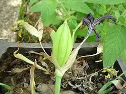 The iris fruit is a capsule which opens up in three parts to reveal the numerous seeds within. In some species, the seeds bear an aril, such as Iris stolonifera which has light brown seeds with thick white aril.[12]