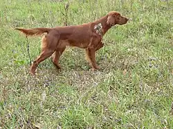 It was noted as early as 1845 that setters in Ireland were predominantly either red, or, according to Youatt,[5] "...very red, or red and white, or lemon coloured, or white patched with deep chestnut." Clearly, the preference for a solid red-coloured dog was having an effect on the appearance of the typical Irish-bred setter.