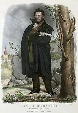 Daniel O'Connell was the leader of the moderate tendency. O'Connell, head of the Catholic Association and Repeal Association in the 1820s, 1830s and 1840s, campaigned for Catholic emancipation – full political rights for Catholics – and then Repeal of the Union, or Irish self-government under the Crown. Catholic emancipation was achieved, but self-government was not. O'Connell's movement was more explicitly Catholic than its eighteenth-century predecessors.[21] It enjoyed the support of the Catholic clergy, who had denounced the United Irishmen and reinforced the association between Irish identity and Catholicism. The Repeal Association used traditional Irish imagery, such as the harp, and located its mass meetings in sites such as Tara and Clontarf which had a special resonance in Irish history.