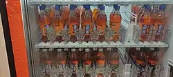Originally selling it as Iron Brew, the drink's makers, A.G. Barr, were forced to change the name of the drink in 1946 following a change in the law that stipulated that the marketing of products be "literally true". As the drink did not contain much iron, nor was it brewed, the passage of this legislation led the company to change the product's name to the presently used Irn-Bru.[9] Irn-Bru has long been the most popularly consumed soft drink in Scotland, consistently beating rivals such as Coca-Cola, Pepsi and Fanta, and reportedly sells 20 cans every second throughout Scotland.[10] Irn-Bru is sold in a number of international food and drink markets, including countries such as the Netherlands, Spain, Belgium, Malta, certain countries of the African continent, the Middle East, and North America.[11]