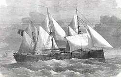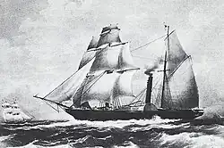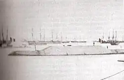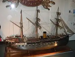The use of wrought iron instead of wood as the primary material of ships' hulls began in the 1830s; the first "warship" with an iron hull was the gunboat Nemesis, built by Jonathan Laird of Birkenhead for the East India Company in 1839. There followed, also from Laird, the first full-sized warship with a metal hull, the 1842 steam frigate Guadalupe for the Mexican Navy.[7][8] The latter ship performed well during the Naval Battle of Campeche, with her captain reporting that he thought that there were fewer iron splinters from Guadalupe's hull than from a wooden hull.[9]