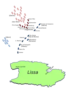 The first fleet battle, and the first ocean battle, involving ironclad warships was the Battle of Lissa in 1866. Waged between the Austrian and Italian navies, the battle pitted combined fleets of wooden frigates and corvettes and ironclad warships on both sides in the largest naval battle between the battles of Navarino and Tsushima.[26]