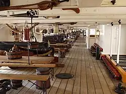 The first ocean-going ironclads carried masts and sails like their wooden predecessors, and these features were only gradually abandoned. Early steam engines were inefficient; the wooden steam fleet of the Royal Navy could only carry "5 to 9 days coal",[60] and the situation was similar with the early ironclads. Warrior also illustrates two design features which aided hybrid propulsion; she had retractable screws to reduce drag while under sail (though in practice the steam engine was run at a low throttle), and a telescopic funnel which could be folded down to the deck level.[61]