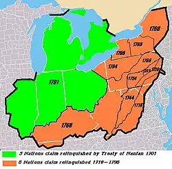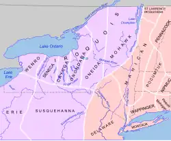 ![]() Map showing historical (in purple) and currently recognized (in pink) Iroquois territorial claims | |